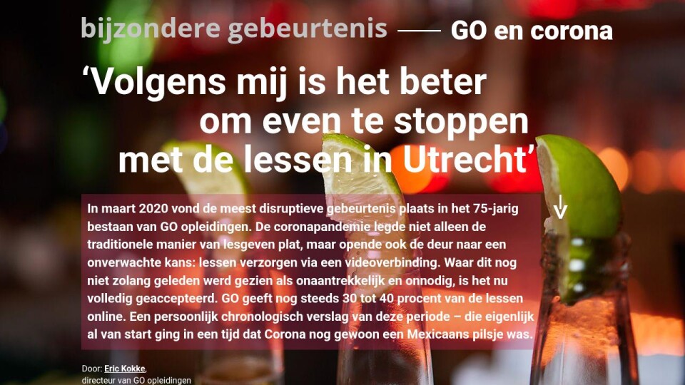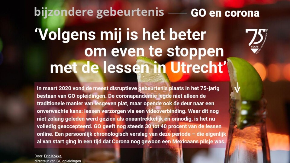 In maart 2020 vond de meest disruptieve gebeurtenis plaats in het 75-jarig bestaan van GO opleidingen. De coronapandemie legde niet alleen de traditionele manier van lesgeven plat, maar opende ook de deur naar een onverwachte kans: lessen verzorgen via een videoverbinding. Waar dit nog niet zolang geleden werd gezien als onaantrekkelijk en onnodig, is het nu volledig geaccepteerd. GO geeft nog steeds 30 tot 40 procent van de lessen online. Een persoonlijk chronologisch verslag van deze periode – die eigenlijk al van start ging in een tijd dat Corona nog gewoon een Mexicaans pilsje was.