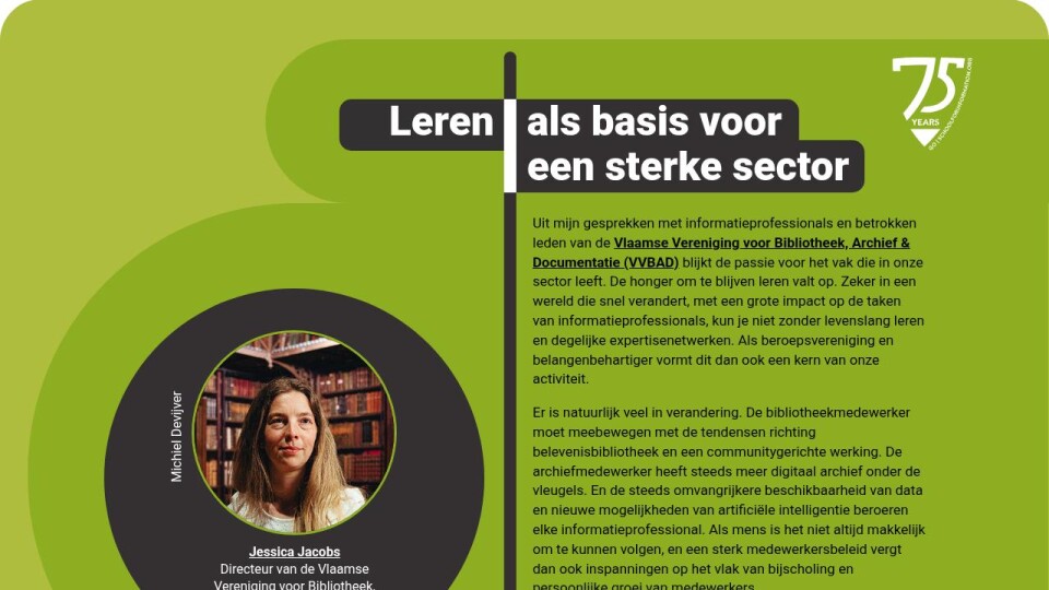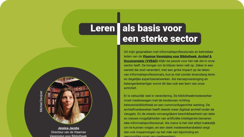 Uit mijn gesprekken met informatieprofessionals en betrokken leden van de Vlaamse Vereniging voor Bibliotheek, Archief & Documentatie (VVBAD) blijkt de passie voor het vak die in onze sector leeft. De honger om te blijven leren valt op. Zeker in een wereld die snel verandert, met een grote impact op de taken van informatieprofessionals, kun je niet zonder levenslang leren en degelijke expertisenetwerken. Als beroepsvereniging en belangenbehartiger vormt dit dan ook een kern van onze activiteit.
