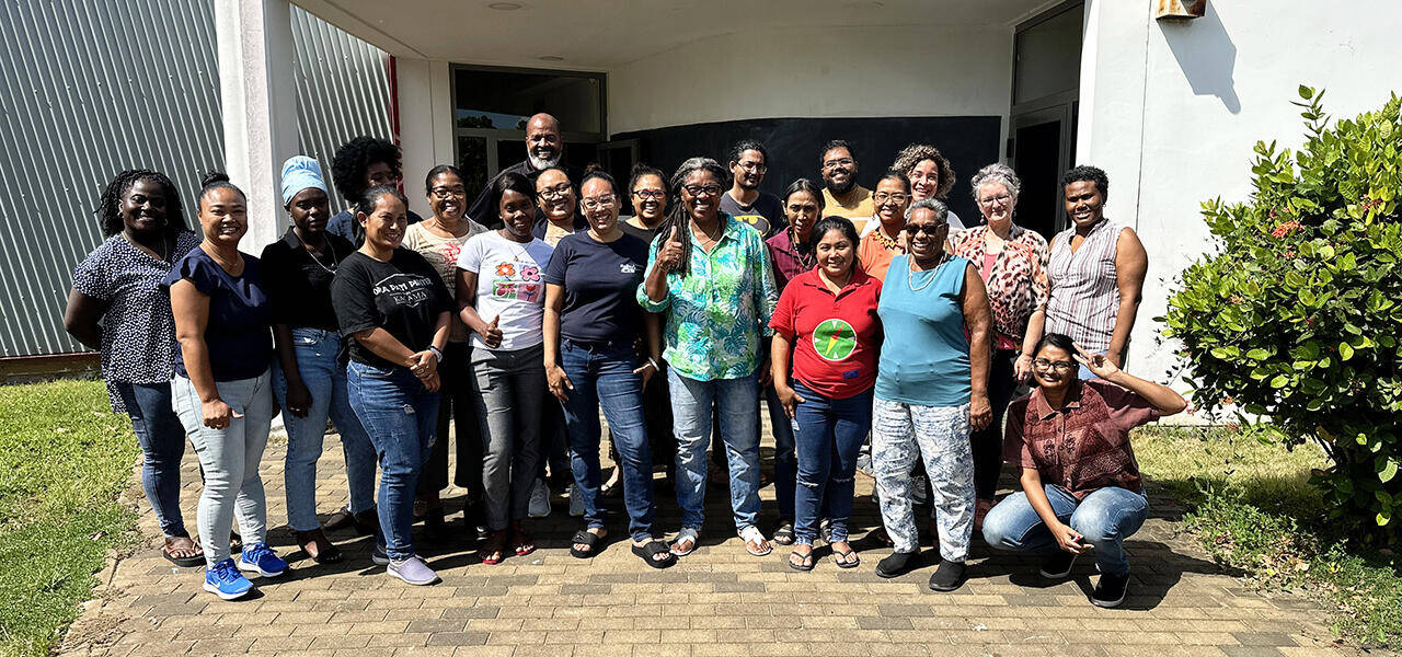 De groep cursisten op de trap van de Frater Lambertus Bibliotheek in Paramaribo.