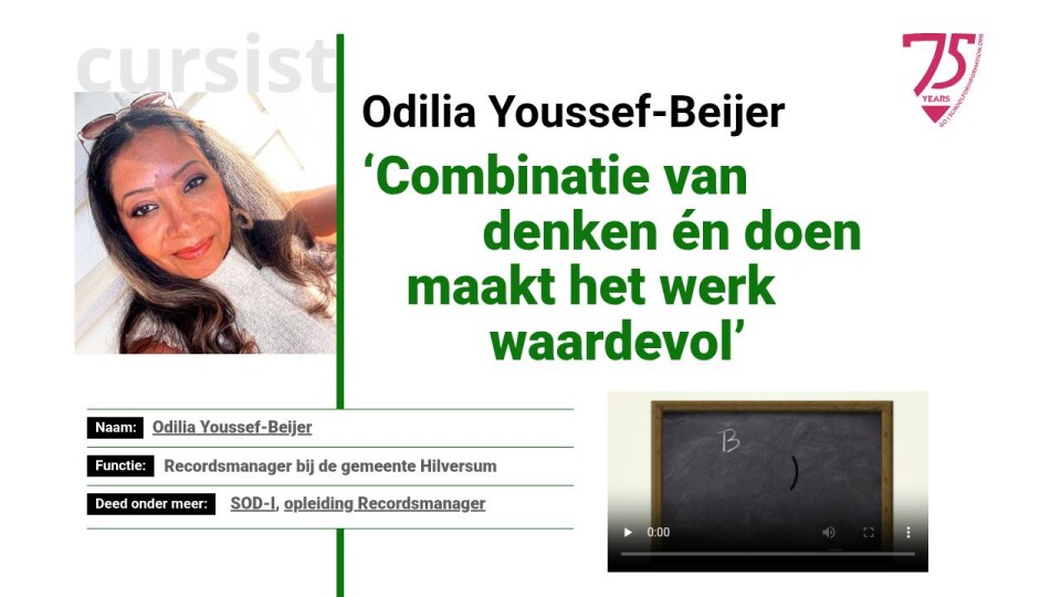 ‘De afgelopen jaren heb ik een brede basis opgebouwd in administratieve en secretariële functies, daarnaast ben ik me gaan specialiseren in informatiebeheer. SOD-I was mijn eerste stap in de informatiesector. Hiermee kreeg ik een goed inzicht in het vakgebied en de breedte ervan. Ik had toen nog geen werkplek, maar wel een stageplek waar ik kon oefenen met het ontvangen en registeren van informatie. Een aantal aspecten herkende ik ook niet direct omdat ik me meer bezighield met recordsmanagement op tactisch niveau dan met het uitvoerende werk.