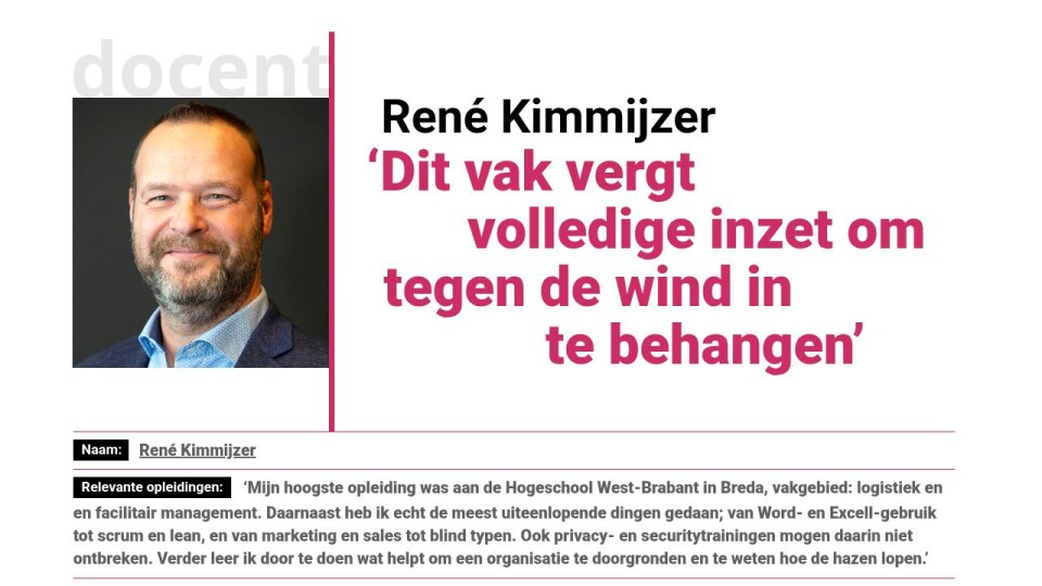 ‘Er komt eigenlijk niet direct een leuke anekdote tijdens mijn docentschap in me op. Wat wel een leuk wetenswaardigheidje is, is dat collega-vakbroeders en -zusters en andere belanghebbenden door hun contact met mij vanuit met een nieuwe blik naar ons werkveld kijken. Dat zorgt er ook voor dat ik blijf doen wat ik doe.’