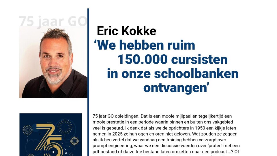 75 jaar GO opleidingen. Dat is een mooie mijlpaal en tegelijkertijd een mooie prestatie in een periode waarin binnen en buiten ons vakgebied veel is gebeurd. Ik denk dat als we de oprichters in 1950 een kijkje laten nemen in 2025 ze hun ogen en oren niet geloven. Wat zouden ze zeggen als ik hen vertel dat we vandaag een training hebben verzorgd over prompt engineering, waar we een discussie voerden over ‘praten’ met een pdf-bestand of datzelfde bestand laten omzetten naar een podcast …? Of zouden ze herkennend hebben geknikt tijdens onze cursus ‘Maak het vindbaar’ over classificeren en thesauri?