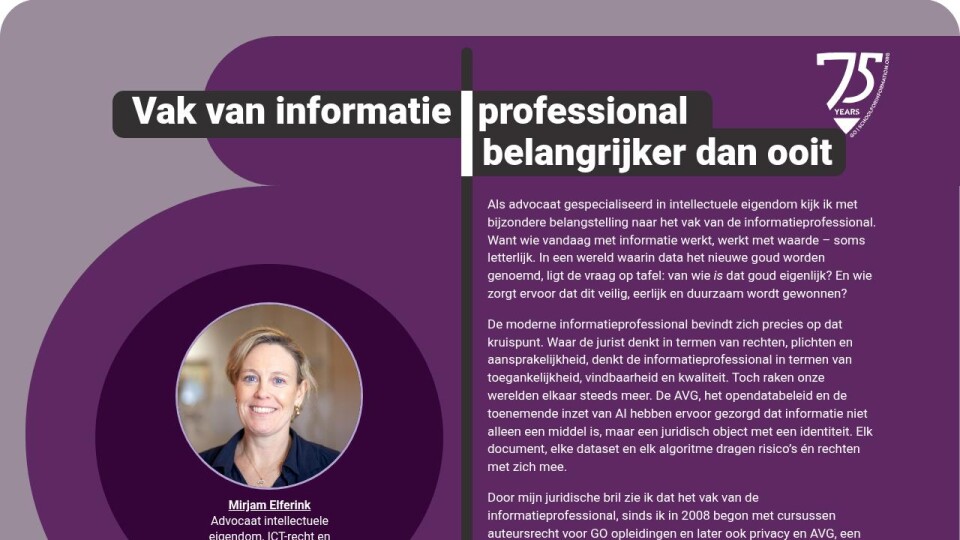 Door mijn juridische bril zie ik dat het vak van de informatieprofessional, sinds ik in 2008 begon met cursussen auteursrecht voor GO opleidingen en later ook privacy en AVG, een flinke ontwikkeling heeft doorgemaakt. Waar men vroeger vooral sprak over archivering en documentbeheer, gaat het nu over governance, compliance en ethiek. De informatieprofessional is niet langer de beheerder van een archiefkast, maar de hoeder van het geheugen én geweten van de organisatie. Hij of zij weet niet alleen waar informatie staat, maar ook waarom die daar mag staan – en of dat morgen nog zo zal zijn.