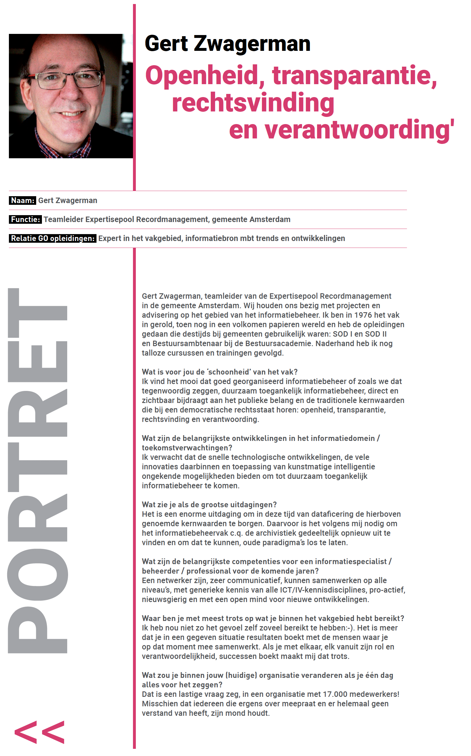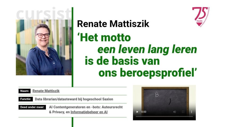 ‘De technologische vooruitgang bracht ook kunstmatige intelligentie op mijn pad, wat nieuwe vraagstukken opleverde op het gebied van informatiebeheer, data-ethiek en kennisveiligheid. In 2024 volgde ik samen met mijn collega’s de cursus AI Contentgeneratoren en -bots: Auteursrecht & Privacy, waarin we onderzochten hoe we AI veilig kunnen inzetten in onderzoek en informatiebeheer. Dit onderwerp werd verder verdiept in 2025, met de cursus Informatiebeheer en AI. AI-geletterdheid is inmiddels een onmiskenbare vaardigheid voor iedereen die werkzaam is in het informatiedomein.