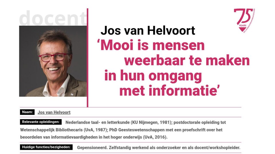 ‘Met mijn achtergrond in informatievaardigheden is de parel van ons vakgebied voor mij de kans die je als informatieprofessional hebt om mensen zelfredzaam en weerbaar te maken in hun omgang met informatie. Persoonlijk haal ik bovendien veel voldoening uit de metacognitieve laag die het vak ook kent: het nadenken over de manier waarop ik zelf informatie gebruik om te leren en wijzer te worden.’