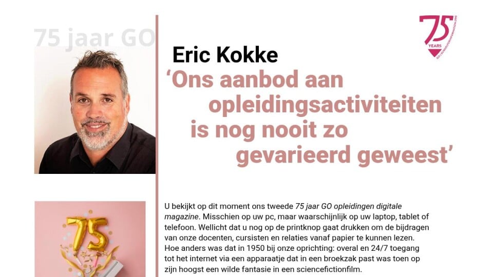 U bekijkt op dit moment ons tweede 75 jaar GO opleidingen digitale magazine. Misschien op uw pc, maar waarschijnlijk op uw laptop, tablet of telefoon. Wellicht dat u nog op de printknop gaat drukken om de bijdragen van onze docenten, cursisten en relaties vanaf papier te kunnen lezen. Hoe anders was dat in 1950 bij onze oprichting: overal en 24/7 toegang tot het internet via een apparaatje dat in een broekzak past was toen op zijn hoogst een wilde fantasie in een sciencefictionfilm.