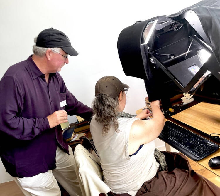 Brewster Kahle bij Internet Archive’s book scanning machine, Amsterdam