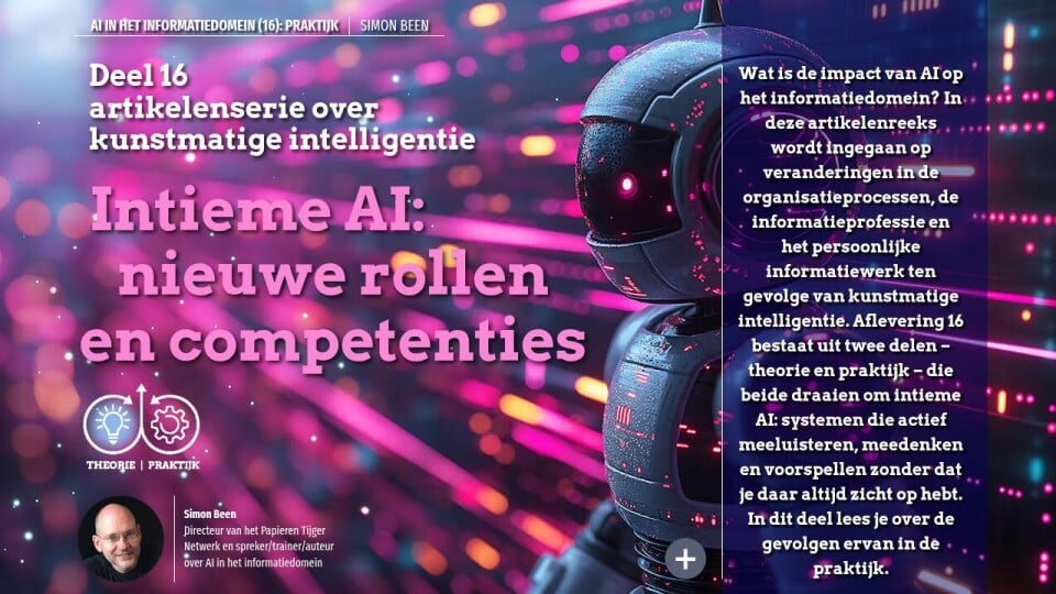 Wie relevant wil blijven als informatieprofessional in het tijdperk van intieme AI heeft meer nodig dan technische vaardigheden. Het gaat om een nieuw soort professionaliteit: eentje die de werking en impact van AI begrijpt en weet hoe je die technologie verantwoord inzet binnen informatieprocessen. Denk aan: