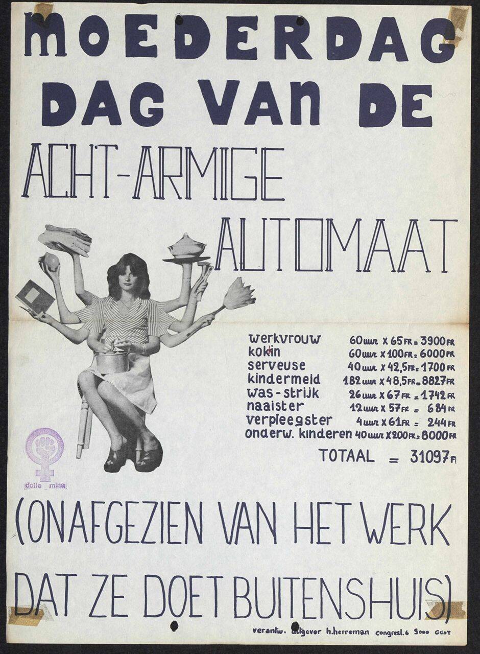 Poster ‘Moederdag: dag van de acht-armige automaat’, door Dolle Mina, 1973. Collectie AVG, Brussel.