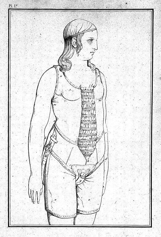 Prent van een kuisheidsgordel uit het boek Considérations sur les hernies abdominales, sur les bandages herniaires rénixigrades et sur de nouveaux moyens de s’opposer à l’onanisme, door Guillaume Jalade-Lafond, 1822. Collectie Design Museum Den Bosch.