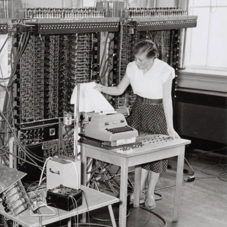 Oude computers komen ook op de tentoonstelling voorbij – die hadden vaak een verrassende link met vrouwen. Zoals de gigantische IBM 1404, de eerste commercieel succesvolle computer, die werd geïntroduceerd in 1959. Voor die tijd werd het rekenwerk bij bedrijven vaak gedaan door vrouwen en was het laag gewaardeerd. De computer zorgde echter voor een symbolische herwaardering: de machine werd belangrijk, dus het werk eraan ook, en daarmee ‘mannelijk’. <